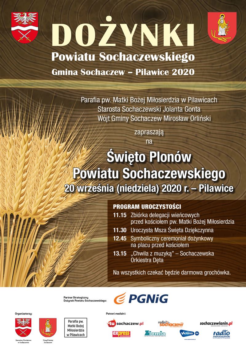 Serdecznie zapraszamy do udziału w tegorocznych dożynkach powiatowych. W tym roku będziemy przeżywali Święto Plonów Powiatu Sochaczewskiego wspólnie z Gminą Sochaczew. Głównym punktem uroczystości, które odbędą się 20 września w Pilawicach, będzie Msza Św. odprawiona w kościele parafialnym o godzinie 11.30. Szczegóły na plakacie.