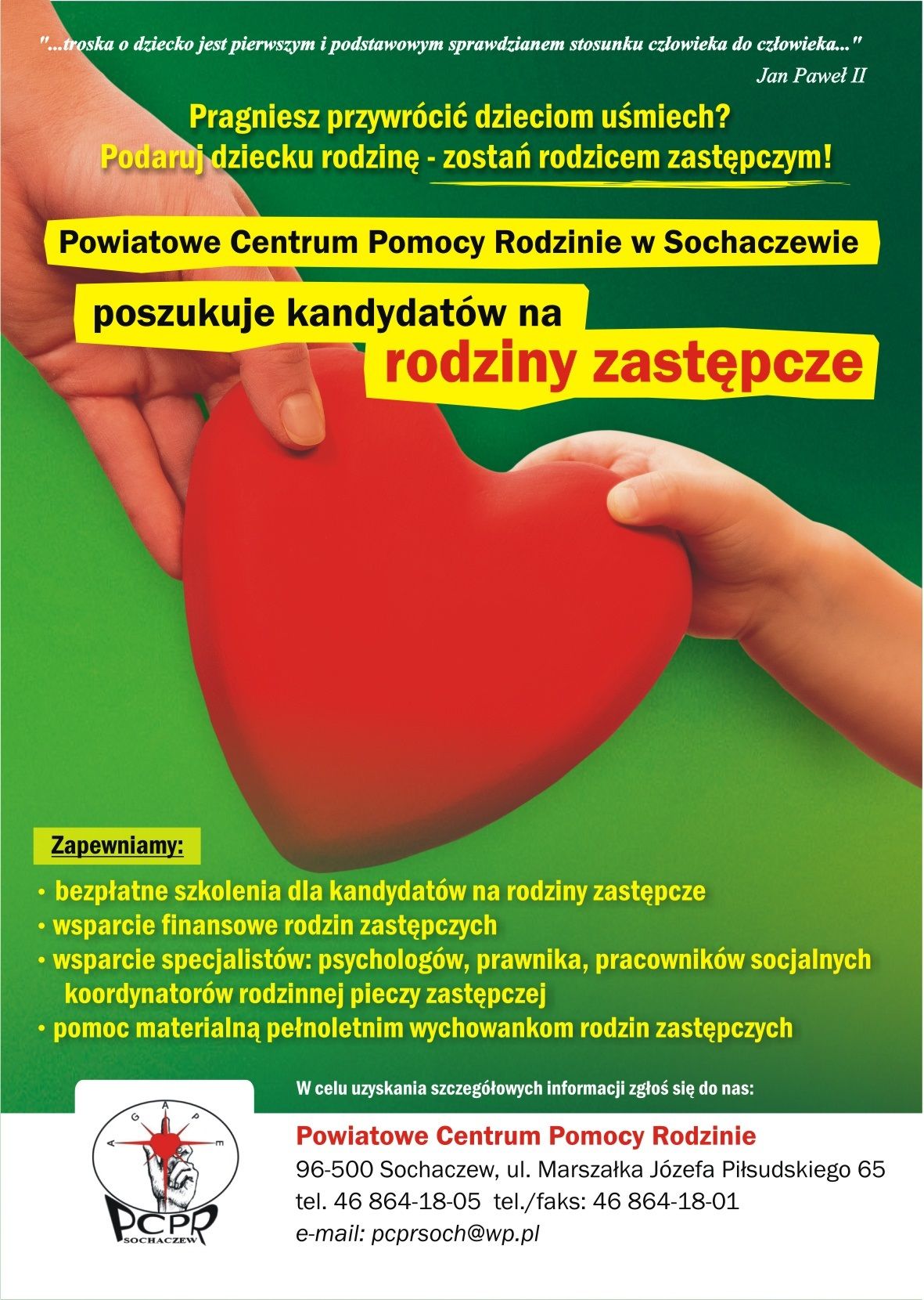 Osoby zainteresowane prosimy o kontakt osobisty lub telefoniczny (46) 864 18 01. Szczegółowe informacje dotyczące szkolenia oraz rodzinnej opieki zastępczej można uzyskać również w siedzibie PCPR w Sochaczewie w godzinach: