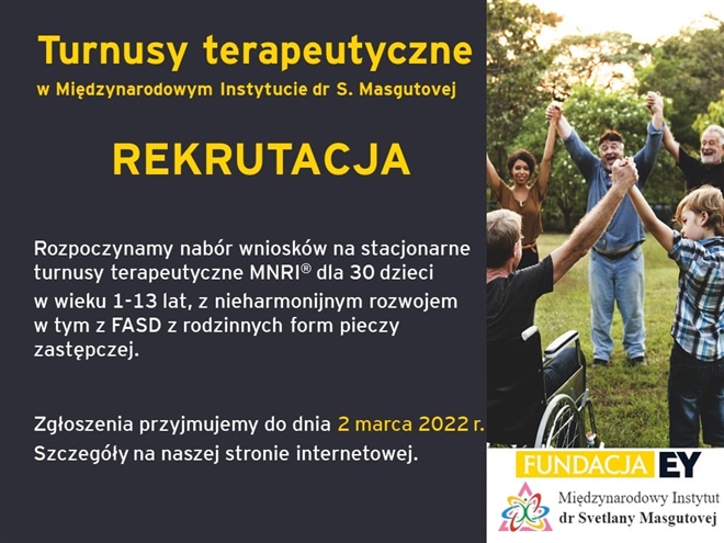 Z nowym rokiem Fundacja EY rusza z kolejnym projektem Zapraszają na 5 edycję projektu stacjonarnego Turnusu Terapeutycznego metodą MNRI® w Instytucie dr S. Masgutovej w Warszawie! Przewidują mi...