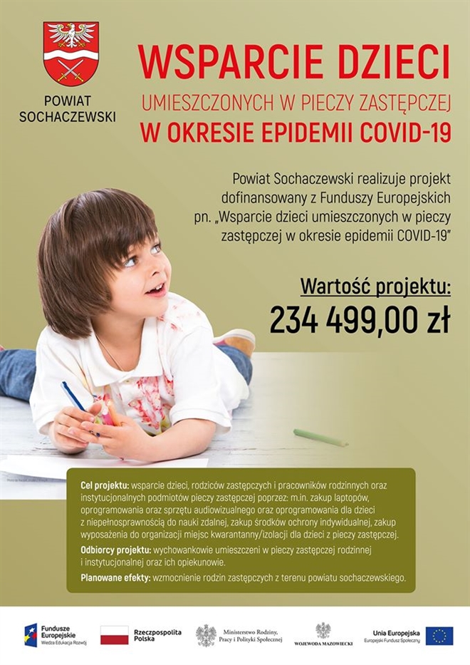 Powiat sochaczewski realizuje projekt dofinansowany z Funduszy Europejskich pn. „Wsparcie dzieci umieszczonych w pieczy zastępczej w okresie epidemii COVID-19”. W ramach prowadzonego przez Ministerstwo Rod...