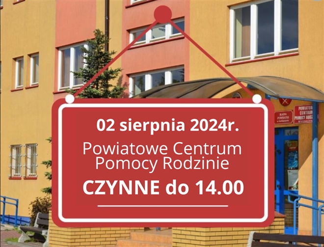 Informujemy, że dziś tj. w piątek, 23 sierpnia br. Powiatowe Centrum Pomocy Rodzinie (mieszczące się przy ul. marsz. J. Piłsudskiego 65) z przyczyn od nas niezależnych spowodowanych awarią sieci wodno-kanalizacyjnej b...