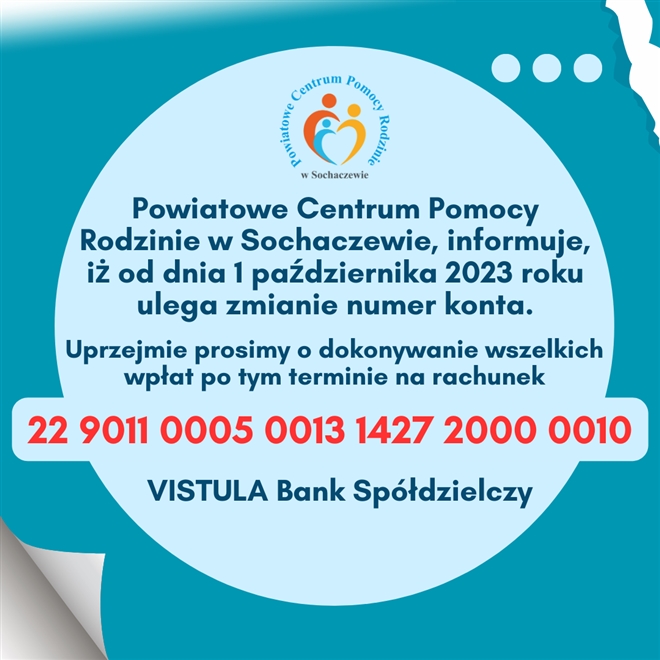 Powiatowe Centrum Pomocy Rodzinie w Sochaczewie, informuje, iż od dnia 1 października 2023 roku ulega zmianie numer konta. Uprzejmie prosimy o dokonywanie wszelkich wpłat po tym terminie na rachunek 22 9011 ...