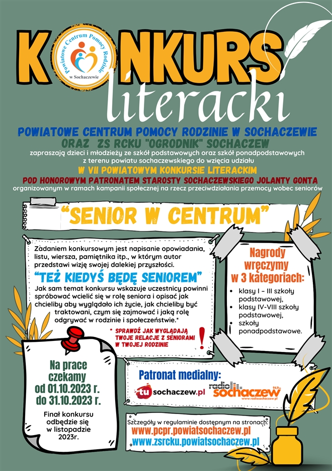 Uwaga, uwaga już w najbliższy poniedziałek startuje VII POWIATOWY KONKURS LITERACKI pod Honorowym Patronatem Starosty Sochaczewskiego Jolanty Gonta. Razem z ZS RCKU "Ogrodnik" Sochaczew zapraszamy dzieci i młod...
