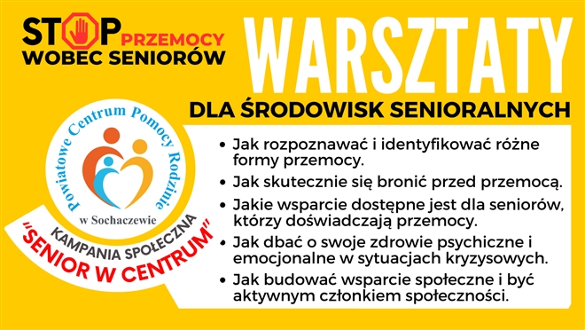W ramach trwającej kampanii na rzecz przeciwdziałania przemocy wobec osób starszych „Senior w centrum” serdecznie zapraszamy Seniorów na warsztaty zwiększające świadomość oraz umiejętności ...
