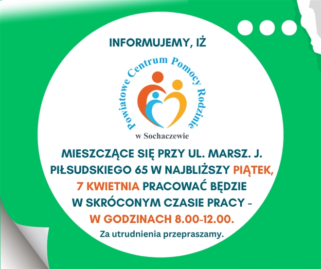 Powiatowe Centrum Pomocy Rodzinie w Sochaczewie informuje, iż w najbliższy piątek, 7 kwietnia pracować będzie w skróconym czasie pracy - w godzinach 8.00-12.00. Za utrudnienia przepraszamy.