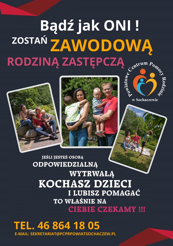 Zostań rodziną pomocową Powiatowe Centrum Pomocy Rodzinie w Sochaczewie zaprasza osoby, które chciałyby zostać rodziną pomocową. Jeśli w Twojej głowie pojawiła się myśl, że może Ty mógłbyś po...