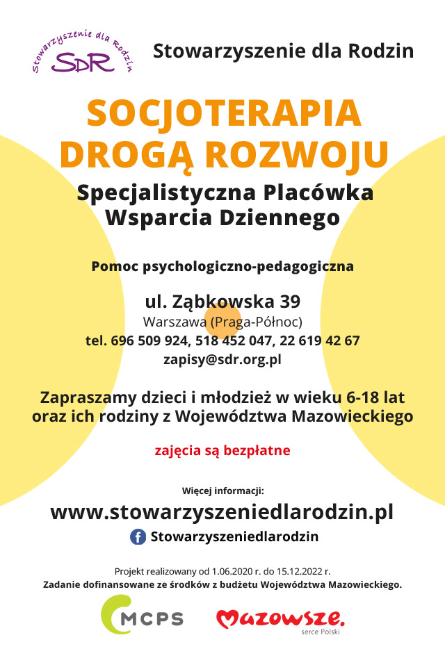 Placówka Wparcia Dziennego, ul. Ząbkowska 39 m.1, Warszawa (Praga Północ), Zespół Psychologiczno-Terapeutyczny z ogrodem przy ul. Nefrytowa 12, Warszawa (Targówek).