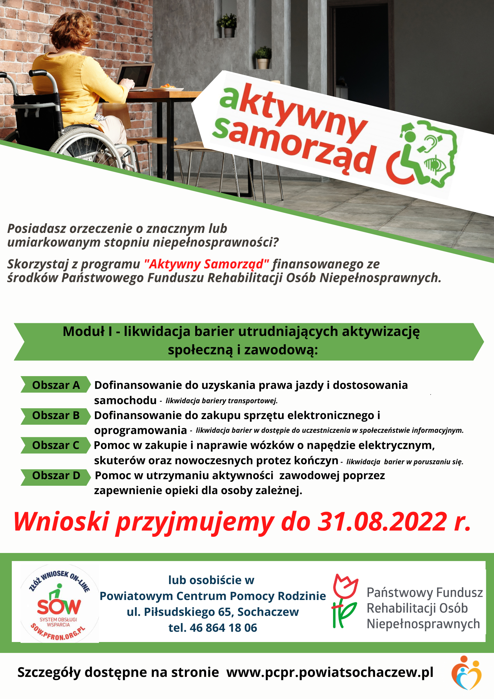 Do środy, 31 sierpnia 2022 roku osoby z niepełnosprawnością mogą składać wnioski o dofinansowanie w programie „Aktywny samorząd”.