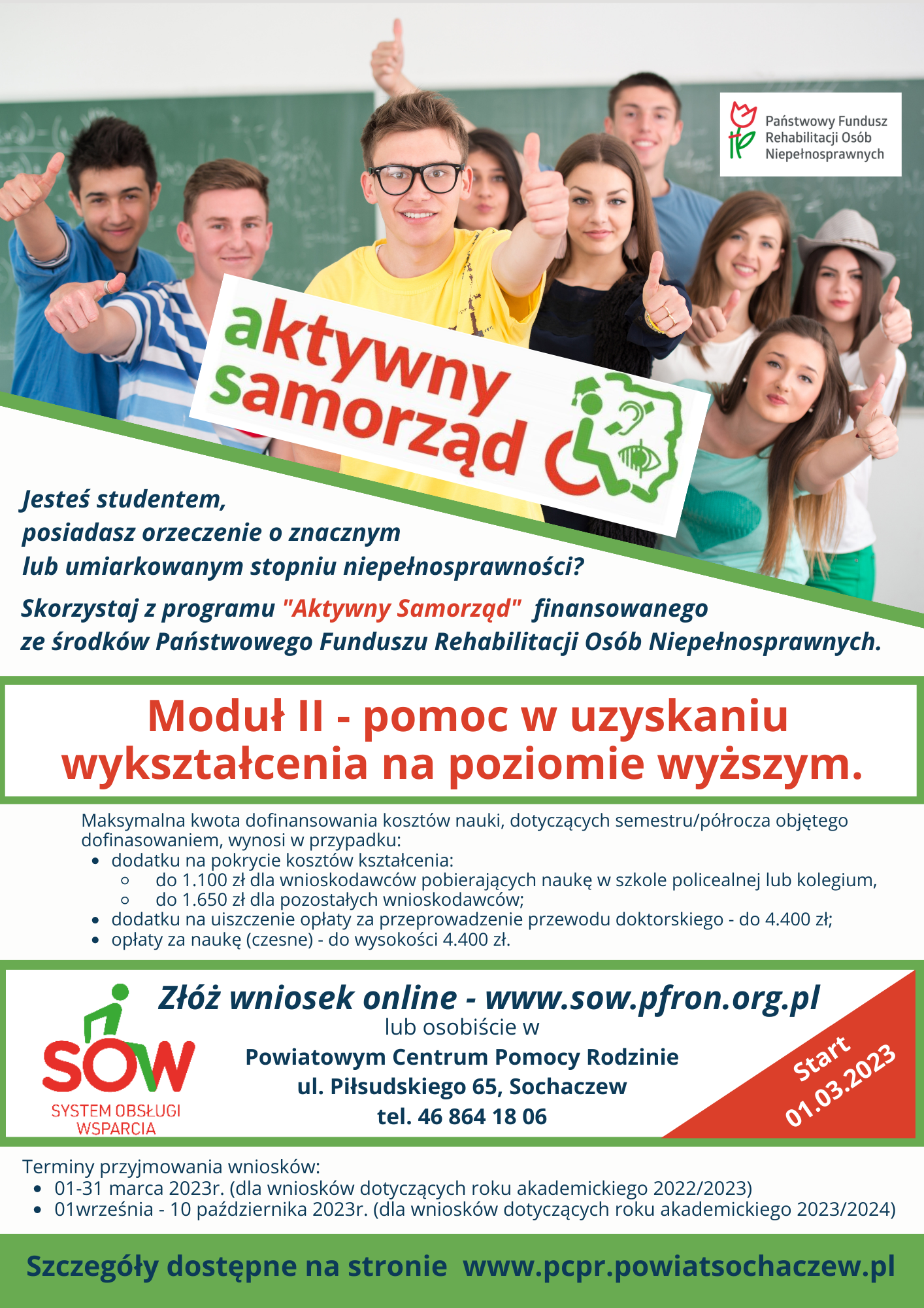 Jesteś studentem i posiadasz orzeczenie o znacznym lub umiarkowanym stopniu niepełnosprawności - skorzystaj z programu "Aktywny Samorząd" Moduł II i otrzymaj dofinansowanie do uzyskania wykształcenia na poziomie wyższym.