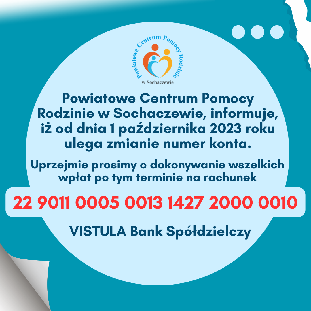 Powiatowe Centrum Pomocy Rodzinie w Sochaczewie, informuje, iż od dnia 1 października 2023 roku ulega zmianie numer konta.