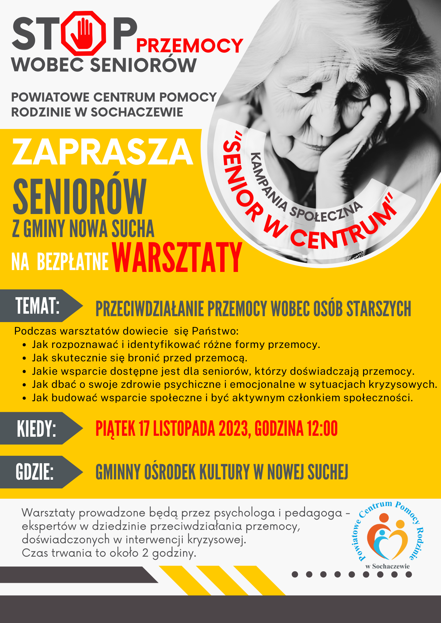 Zapraszamy Seniorów z gminy Nowa Sucha na bezpłatne warsztaty zorganizowane w ramach Kampanii Społecznej na rzecz przeciwdziałania przemocy wobec osób starszych "Senior w Centrum".
