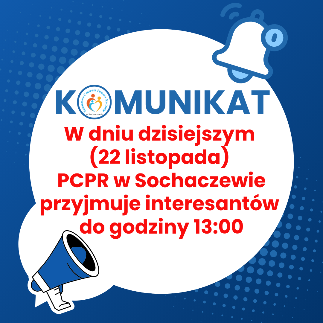 Komunikat! 22-11-2024 10:20 A A A KOMUNIKAT! w dniu dzisiejszym (22 listopada) PCPR w Sochaczewie przyjmuje ineresantów do godziny 13:00. Za utrudnienia przepraszamy.