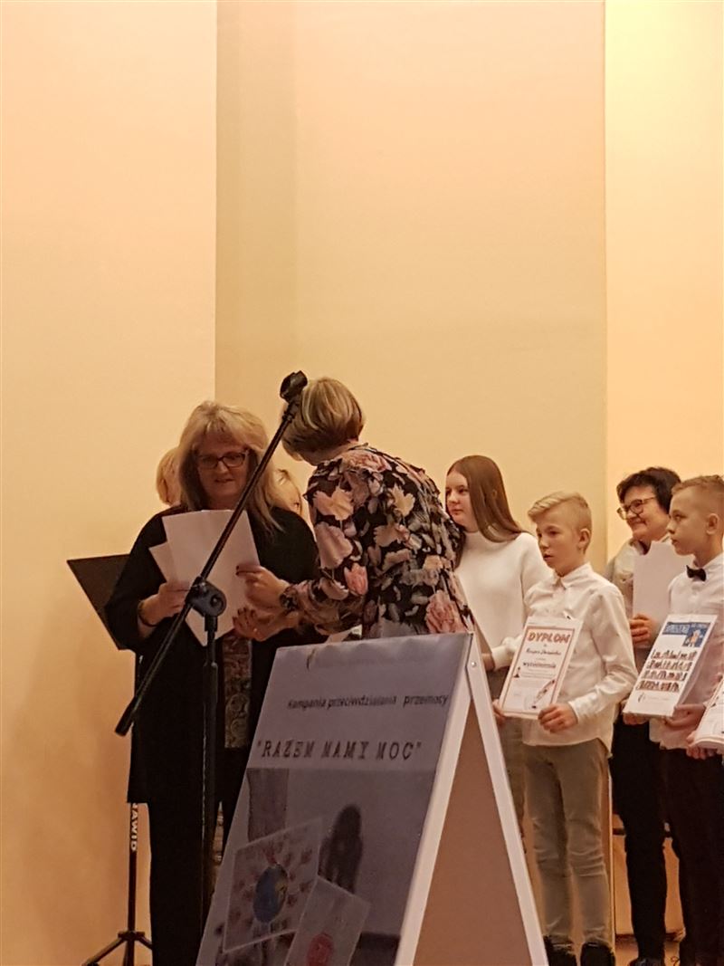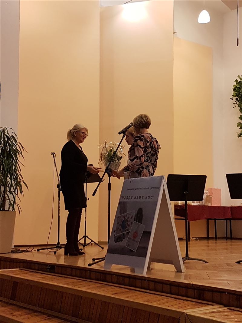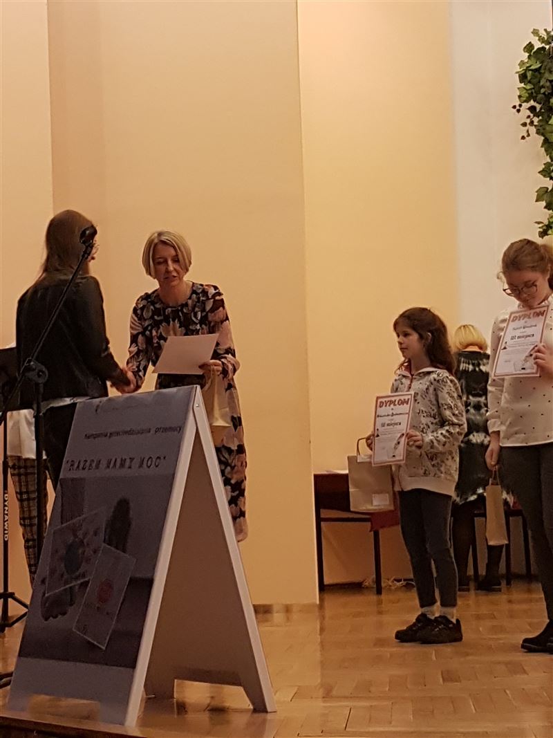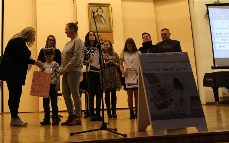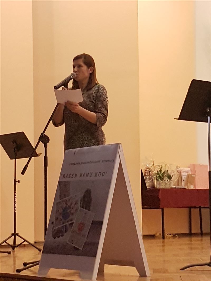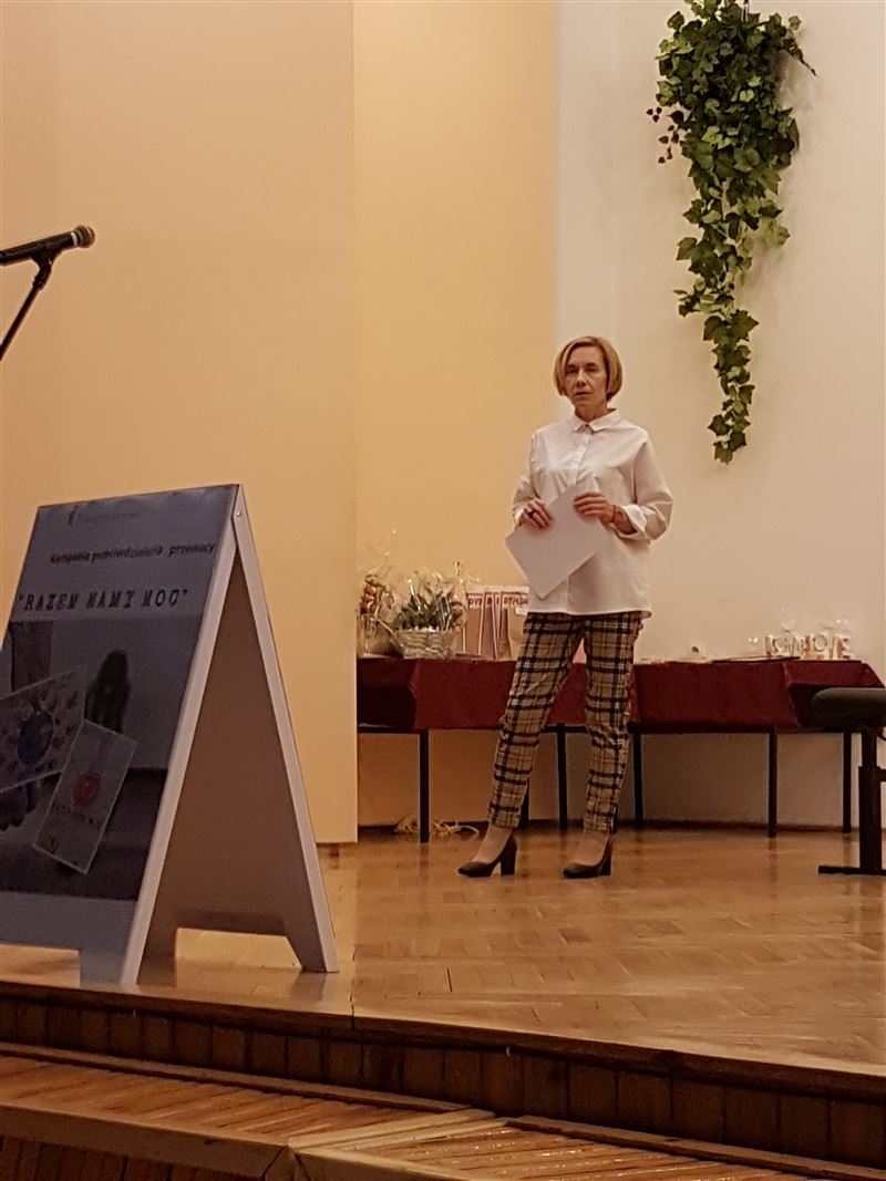 Po koncercie, pani Ewa Kajetaniak, pedagog PCPR podsumowała kampanię „Razem mamy Moc”, po czym przeszliśmy do najbardziej wyczekiwanej części Gali czyli rozdania nagród w IV powiatowym konkursie literackim „Przemoc, której nie widać”.