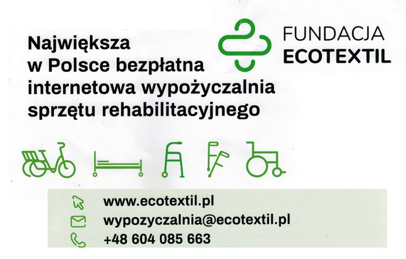 Fundacja Eco Textil informuje, że w ramach jej działalności prowadzona jest pierwsza w Polsce bezpłatna internetowa wypożyczalnia sprzętu rehabilitacyjnego. W swojej ofercie posiadają: