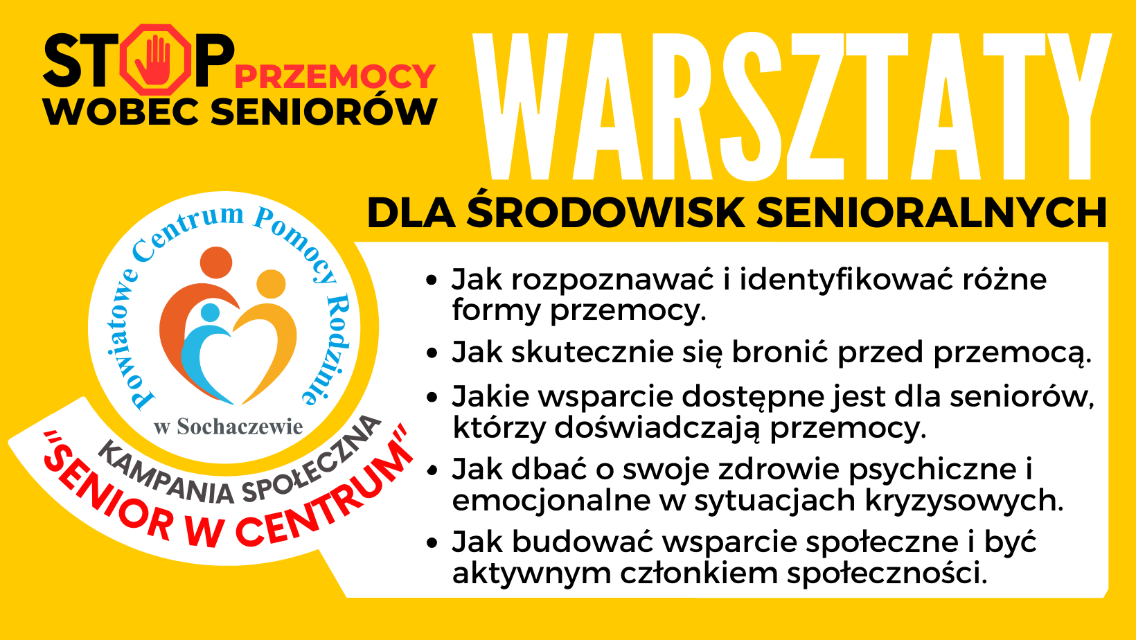 W ramach trwającej kampanii na rzecz przeciwdziałania przemocy wobec osób starszych „Senior w centrum” serdecznie zapraszamy Seniorów na warsztaty zwiększające świadomość oraz umiejętności w zakresie przeciwdziałania wszelkim formom przemocy.